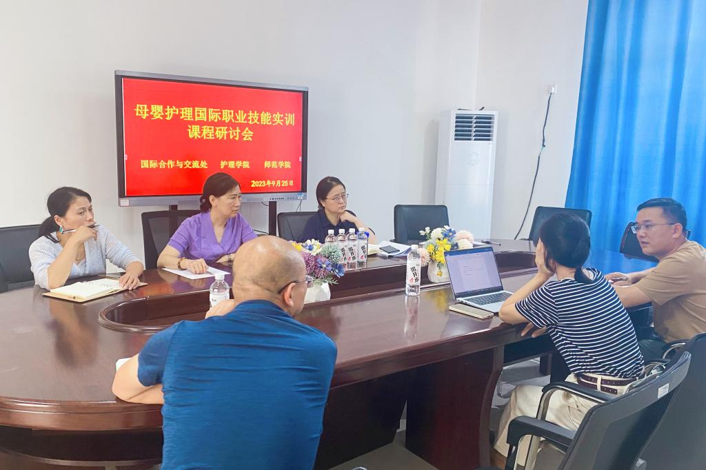 本站讯(国际合作与交流处王若婷)为了高质量服务“一带一路”沿线国家职业教育的发展,伟德官网拟在马来西亚建设职业技能培训中心。9月25日下午,母婴护理职业技能实训课程国际化建设研讨会在博达楼B501室召开。此次研讨会由国际合作与交流处组织,师范学院院长肖勇,护理学院副院长李学坤、相关专业负责人,以及发展规划处钟菊英教授参加了研讨会。