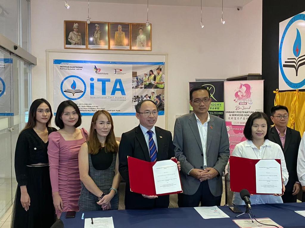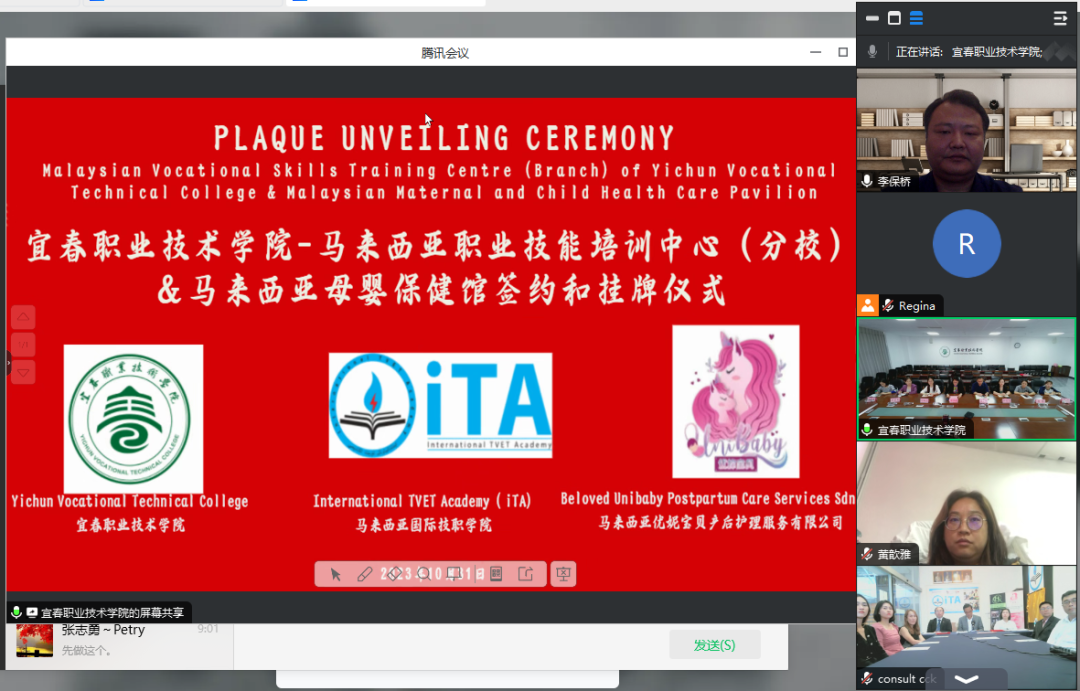 最后,刘江毅代表学校与马来西亚国际技职教育学院、马来西亚优妮宝贝产后护理服务有限公司进行职业技能培训中心(分校)与母婴保健馆线上签约与挂牌。
