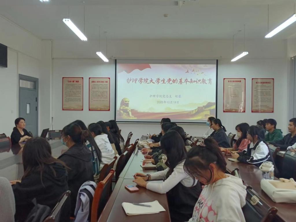 为进一步突出党的政治建设,落实立德树人根本任务,深化大学生理想信念教育,10月21日,护理学院党总支书记胡蓉在和济楼C218开展“永远跟党走 奋进新时代”入党启蒙专题党课活动。参会对象有2022级新生、学生党员(包括预备党员)、发展对象及入党积极分子。