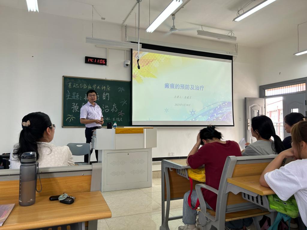 为深化党建品牌建设,拓宽学生临床视野,丰富同学们第二课堂学习活动,5月30日下午,由医学基础部主办、医者初心人文社协办的“基础与临床专题讲座——瘢痕的预防和治疗”在和济楼C419教室举行。本次讲座由医学基础部形态教研室龙瑞文老师主讲,医学基础部教师和医学院、护理学院在校学生约110人参加,讲座由医学基础部副主任邓小珍主持。