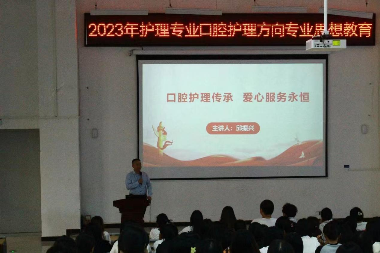 邱振兴以“口腔护理传承、爱心服务永恒”为题,为中高对接学生开展讲座,他从口腔护理的优势、口腔护理的现状、口腔护理的前景、实习单位的环境四个方面介绍,帮助同学们全面、系统地了解口腔护理,为今后的学业生涯规划指明方向。