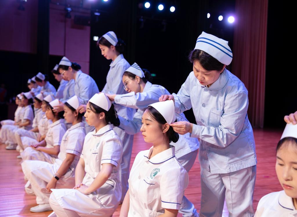 授帽仪式将活动氛围推向高潮。教师代表们将承载着责任与使命的燕尾帽,庄重地戴在每一位学子头上,洁白的燕尾帽在灯光下闪耀着神圣的光芒。随后,护理学院院长易国萍带领全体师生庄严宣誓,清脆而坚定的誓言回荡在整个会场,成为他们未来救死扶伤、守护生命的铮铮誓言。此刻,大家高举起手中的蜡烛,共同合唱《中国护士之歌》,这份精神引领着学院的每一位师生,用爱与责任、专业与担当,不断书写护理事业的新篇章。