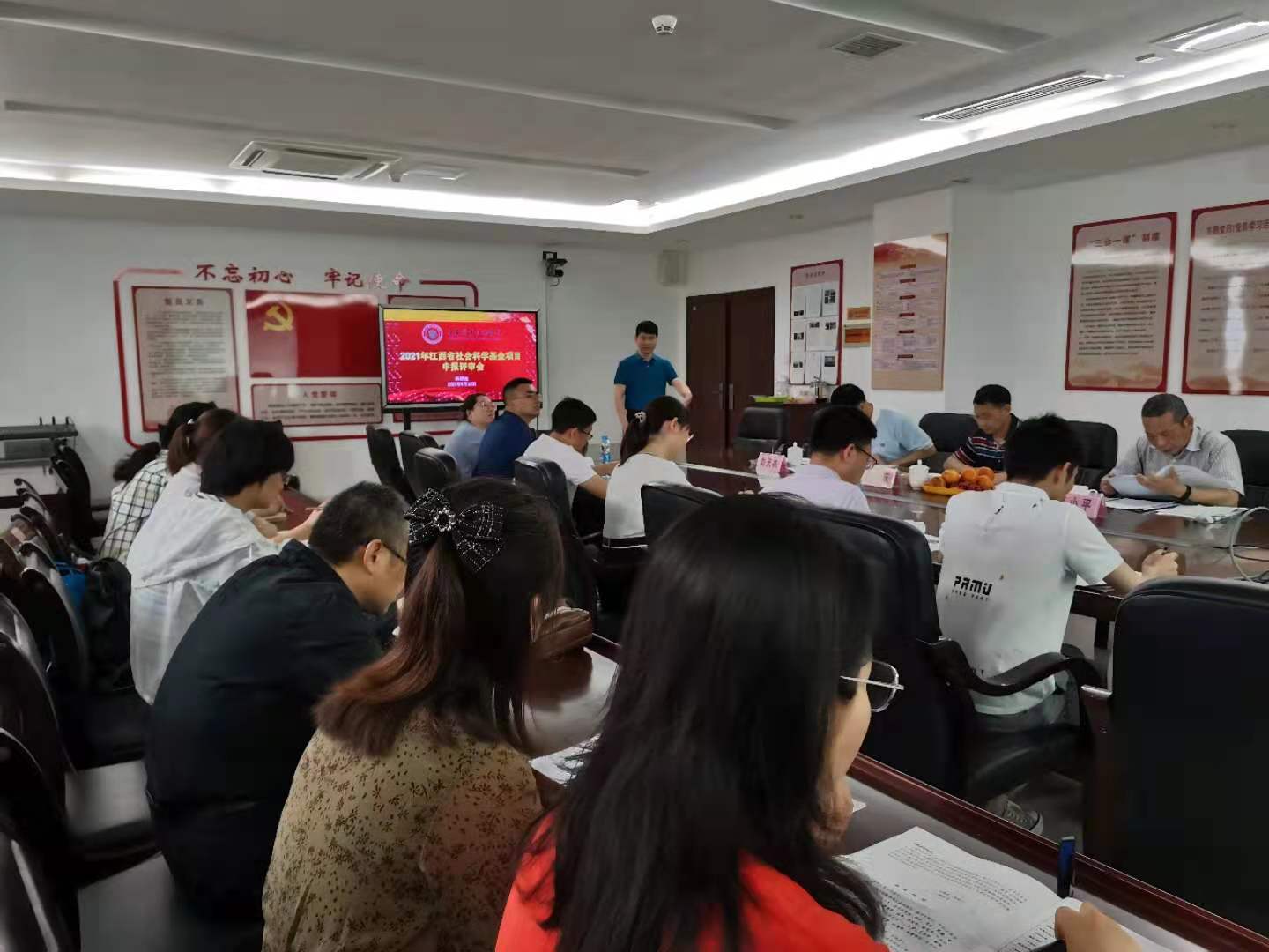 本站讯(科研处 陈艳辉)为提高课题申报质量,5月12日上午,科研处在科技综合楼413会议室组织召开2021年江西省社会科学基金项目申报评审会,由宜春市社会科学界联合会主席高小平、宜春学院科研处处长陈荣庆、宜春学院政法学院院长刘天杰担任评委,由科研处处长熊杰平主持,9个项目组共30余人参加了聆听。