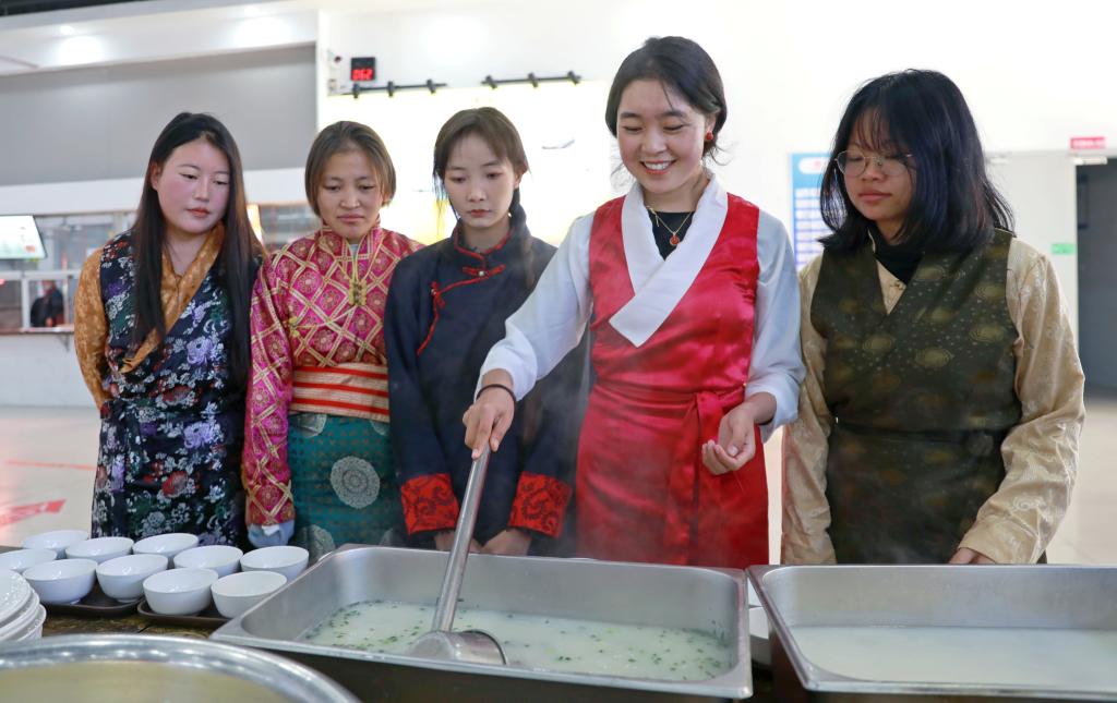 一大早,藏族同学们身着盛装,早早地来到学校博冠餐厅,擀面、剁肉、包包子、炸煎饼,忙得不亦乐乎。