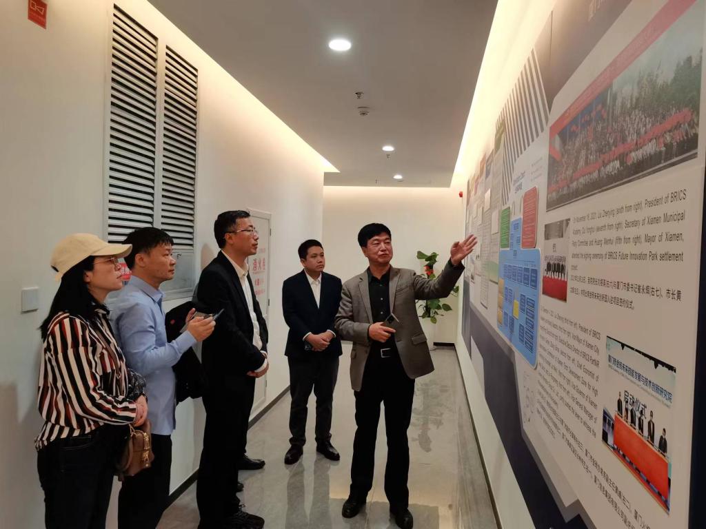 邱军一行首先来到厦门市金砖未来技能发展与技术创新研究院。在研究院副院长明士斌、总监吴剑锋的陪同下,邱军一行参观研究院未来技术展示体验中心,观看视频,听取汇报,深入了解研究院的工作重点、组织架构和项目案例。邱军指出,学校可以在与金砖国家的国际交流、参加金砖国家职业技能大赛、人才培养、就业等方面探讨合作。