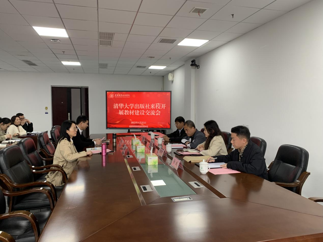 本站讯(教务处 宋慧娟)为助推学校“双高”建设、深化三教改革,提升校本教材建设质量,4月25日下午,清华大学出版社职业教育分社综合业务室主任陈凌云一行来校开展教材建设交流会,副校长易滨秀、教务处处长熊杰平、各院部负责教学与教材建设工作的副院长、各校本教材编写团队参加交流会,会议在天工楼第一会议室举行。