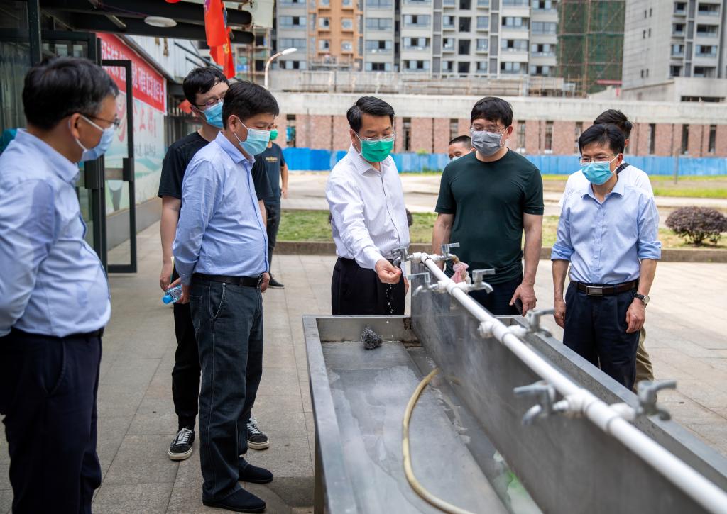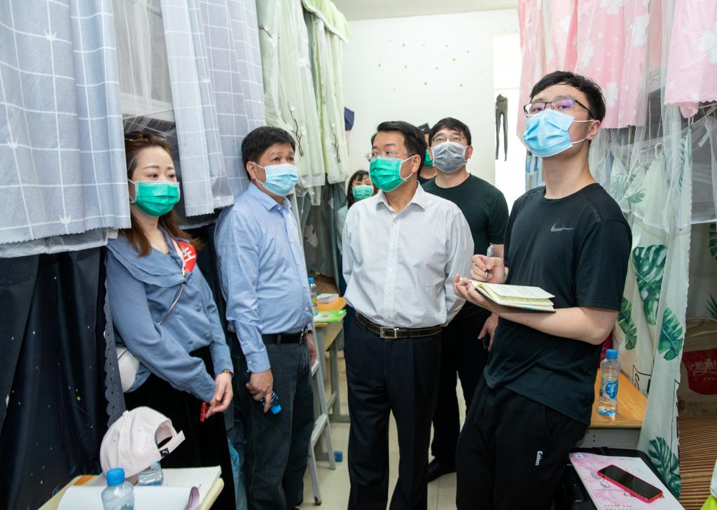 袁川一行还全程参与了南校区的返校疫情防控演练。在校门口,袁川指出,进校路线和隔离区还要更加细化和合理安排,确保已经进行检测的学生和未检测的学生无交叉感染可能。在学生宿舍,袁川要求,宿舍内要加强通风消毒工作,引导学生做好个人防护,宁肯“小题大做”“多做无用功”,也要打赢疫情防控阻击战。食堂内,学生们洗手消毒后分批错时有序领餐,每张餐桌都标注了可就餐位置,保证足够间距。袁川指出,就餐位置标注要清晰醒目,传统水龙头要更换为感应式水龙头,从细节杜绝交叉感染。袁川强调,疫情防控是一项全新的工作,输不起也不能输,前期防疫工作至关重要,学校要明确自身责任,各司其职,特别是出现应急情况,一定要处置得当,应对有序,做到胸有成竹,以万分之万的努力应对万分之一的可能,确保防疫、教学两不误。(摄影 欧阳富萍)