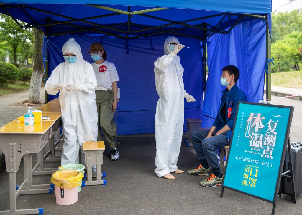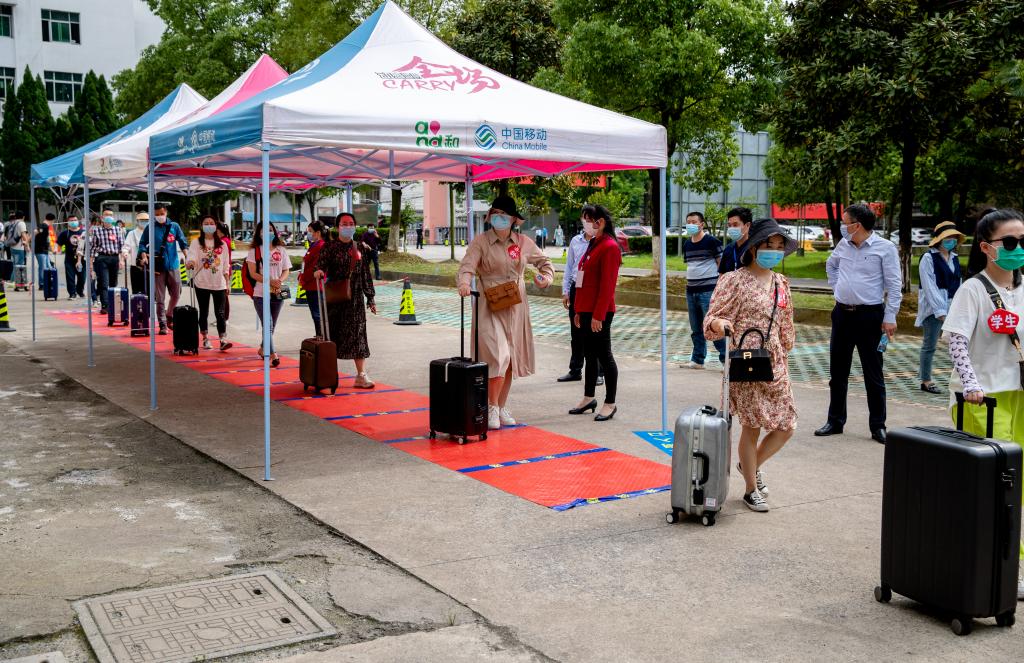 在校本部与南校区门口,由学校辅导员扮演的家长和学生人车分流有序进入校园,并在学校工作人员和志愿者的引导下前往指定位置进行行李消杀、扫健康码和测量体温。体温正常的沿指定路线进入宿舍区,体温异常者由校医引导进入观察区作进一步检测,经医学检测确认体温异常者则由专人专车沿应急专线进入隔离区。