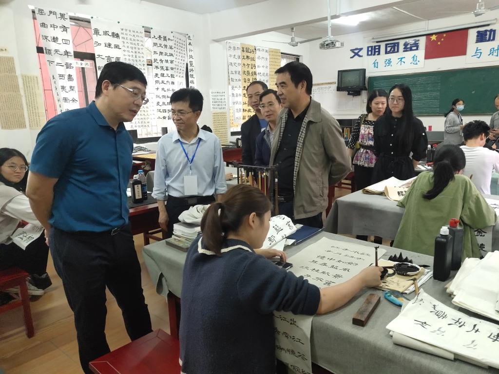 校领导一行在科技楼一楼大厅参观了我院“三化建设”、“优环境,促发展”大讨论活动的展板和师生艺术作品展,实地考察我院的实践教学情况,在19级书法班课堂上,校领导与学生们亲切友好地谈论书法并了解学生的学习、家庭情况。随后,校领导来到多功能厅观看了我院部分艺术实践课程汇报:电声乐队演奏的《New boy》、采茶班表演的戏剧片段《孙成打酒》、《四九看妹妹》,戏腔婉转,动作优雅、艺教班合唱的《踏雪寻梅》、《梨花又开放》,汇报节目获得了领导们的认可和好评。