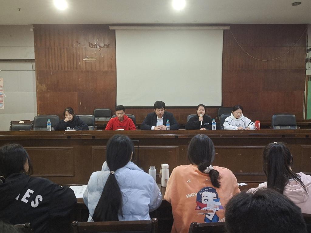 由团总支书记赖朝阳老师发言,他指出了学生会组织的职责所在,并对各位学生会成员提出了以下要求:一是加强与他人交流,提高服务意识。二是不忘初心,多锻练自己,积极付诸于实际当中。接着,主席团主干江一帆、戴炜珑、杨依婷、马彩云陆续发言,提出对学生会的基本要求及考核内容标准。最后由团总支书记赖朝阳老师进行总结,大会圆满结束。