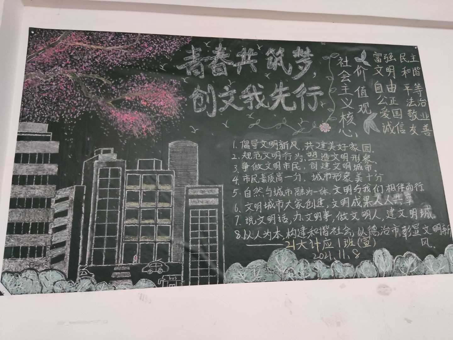 本站讯(信息工程学院 刘嘉妮 学生记者 王雅娉)为响应学校创文工作号召,丰富学们的课余生活,11月9日,信息工程学院举行了以“青春共筑梦,创文我先行”为主题的黑板报评比活动。