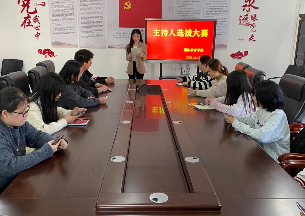 本站讯(国际教育学院 朱媛 学生记者 何雪琪)为了营造丰富多彩的校园文化氛围,展现我院学生的语言综合素质,国际教育学院于11月10日下午在科技综合楼401会议室开展了主持人选拔大赛。此次比赛由国际教育学院团总支书记朱媛和辅导员金岩担当评委。