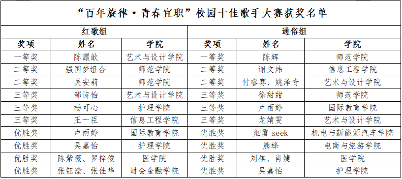 本站讯(团委 梅应轩 学生记者 周义晶 涂杏容 刘华娟 刘臻颖)为庆祝中国共产党成立100周年,鼓励青年大学生传承红色经典、赓续红色精神,为热爱音乐的同学提供一个展现青春魅力与活力的舞台,12月7日晚,由校团委主办的“百年旋律·青春宜职”校园十佳歌手大赛于科技综合楼二楼学术报告厅举行。艺术与设计学院副院长、声乐副教授付菲,艺术与设计学院声乐与合唱指挥教师陈菁,师范学院声乐教师向莹莹、杜文慧担任本次大赛评委。来自各个二级学院共500余名学生代表共同观看了此次比赛,校广播站谢年峰、杨钰菲担任主持。