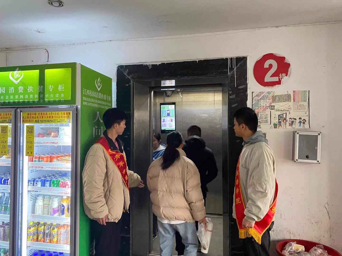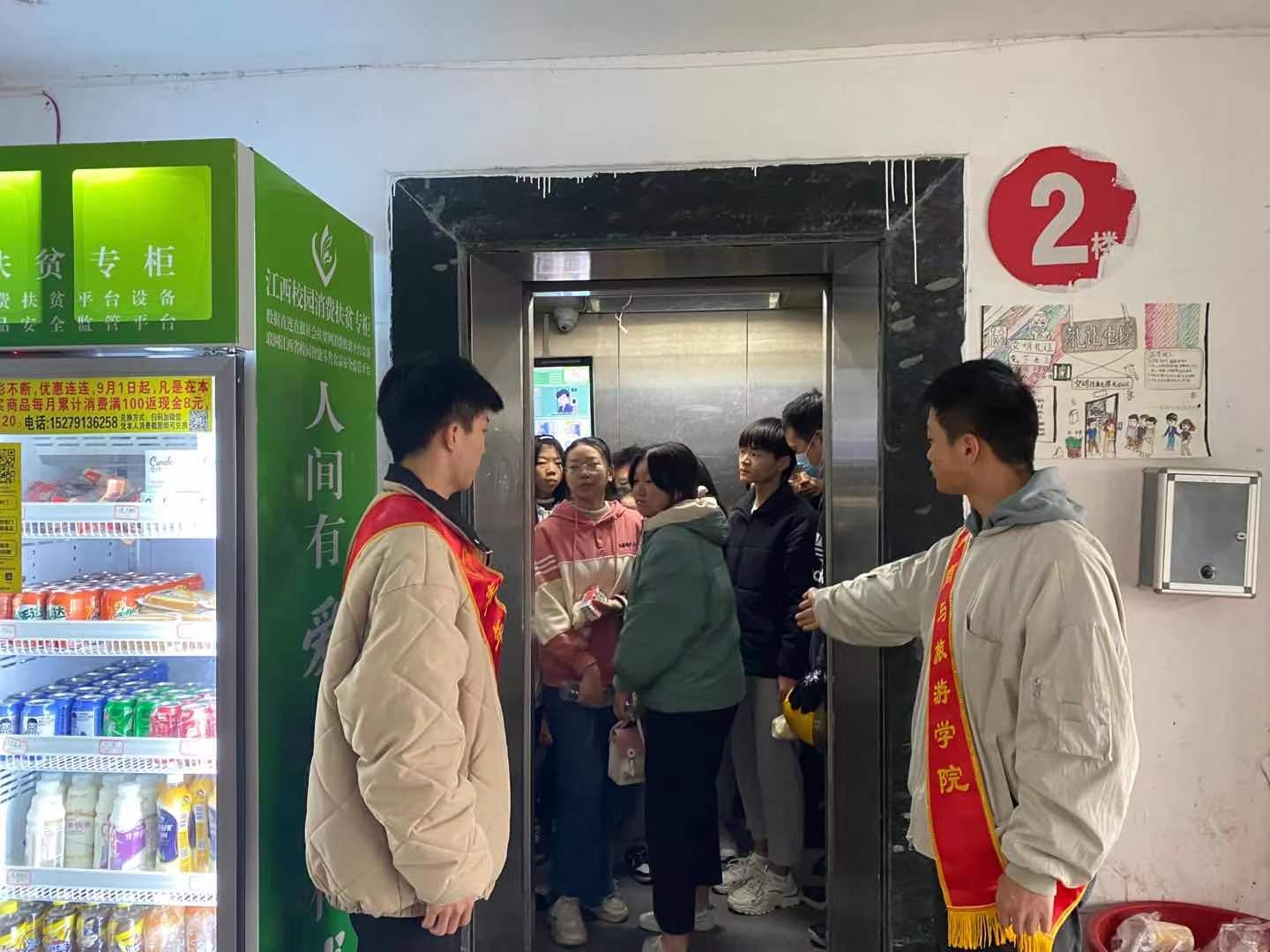 活动中,志愿者们提前到达电梯口,身穿绶带戴着口罩笔直地站在一教一楼地下室和二楼大厅的电梯口,维持秩序,让同学们有序地乘坐电梯,尤其看到有老师或者身体不适的同学乘坐电梯,志愿者们会安排老师或者身体不适的同学优先乘坐电梯。