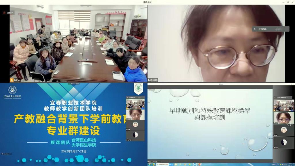 本站讯( 国际合作与交流处 余梦)2022年1月17日上午,由台湾崑山科技大学与伟德官网合作举办的教师教学创新团队培训在老校区科技综合楼401会议室如期举行。此次培训采用线上教学与研讨的形式进行,包括两个主题,分别是“产教融合背景下学前教育专业群建设”、“ ‘双高’ 建设背景下护理专业群建设”。授课团队来自台湾崑山科技大学民生学院,有幼保系系主任周宣辰教授、陈恒霖副教授、王美晴助理教授、杨雅惠助理教授、冯瑜婷讲师、及本系兼任讲师台湾新北市婴幼儿托育协会包崇明理事长,6位老师主讲学前教育专业主题培训;并邀请台湾金门大学护理学系苏贞瑛副教授、魏琦芳助理教授2位老师主讲护理专业主题培训。参训学员是伟德官网师范学院、护理学院50余名教师教学创新团队成员。