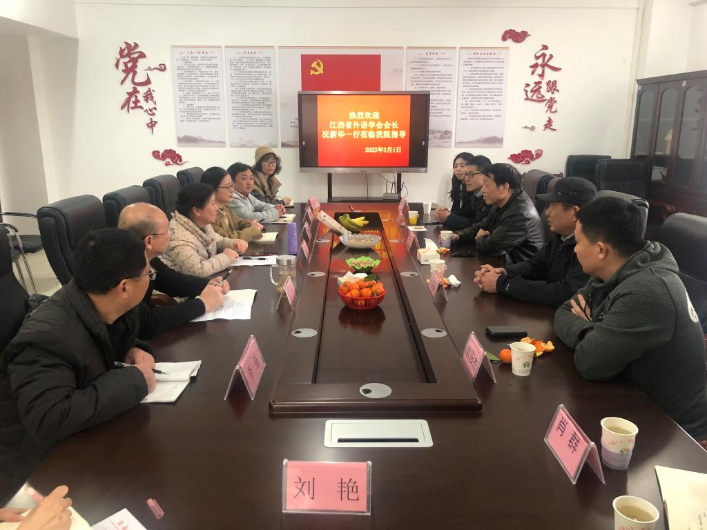 本站讯(会长国际教育学院江萍)3月1日下午,江西省外语学会况新华、秘书长于洪颖等一行8人来我院调研。学院全体班子成员、专业负责人、教研室主任参加调研会。