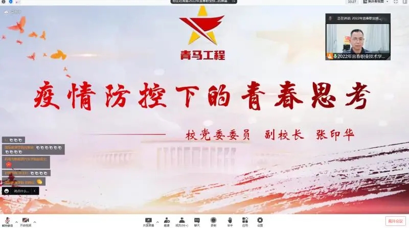 本站讯(团委 梅应轩 学生记者 彭思宇 辛琪)为进一步学习贯彻习近平总书记关于新冠肺炎疫情防控重要讲话精神,增强广大青年学子疫情防控意识、责任担当意识,5月23日晚,伟德官网以线上直播的形式开展2022年“青马工程”大学生骨干第一阶段集中培训班“疫情防控下的青春思考”主题开班讲座,全体“青马班”学员和二级学院团总支书记采用线上观看直播的方式参与此次讲座,校党委委员、副校长张印华担任本次讲座主讲人。