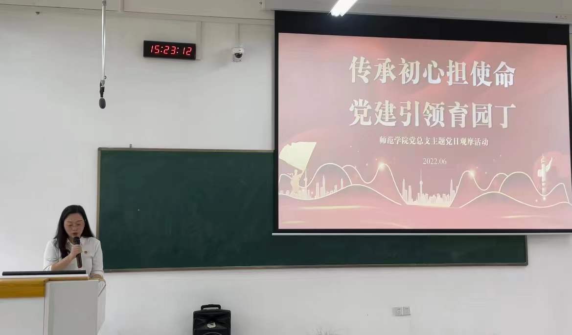 本站讯(师范学院党总支 张婧莉)为迎接党的生日和二十大召开,6月9日下午,师范学院党总支在正心楼D108开展“传承初心担使命 党建引领育园丁”主题党日活动。此次活动由党总支书记邹晓英主持,活动共分为四个部分—— “学习”“感悟”“出彩”“传承”。