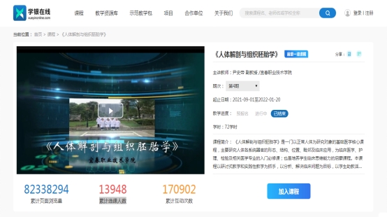 尹史帝老师教学团队精心打造的《人体解剖与组织胚胎学》在线开放课程,主要适用于临床医学、口腔医学、护理和助产四个专业,在第一学期开课。遵循医学人才成长规律,课程内容突出思政教育,实现知识传授与价值塑造并重;赋予学生助教新内涵,激发了教学活力;依托医者初心人文社平台,打造了“人体解剖学竞赛活动月”品牌活动,加大推广应用,吸引外校教师开班入驻,成效显著。目前累计页面浏览量超8200万人次,累计选课人数超1.3万,累计互动次数超17万,2021-2022学年第一学期选修本课程的学员中有1417名学校学生,来自84 所学校;院校班级学员来源于42所学校,共计4015人,校外学员以外省学校为主,并超过了校内学员。