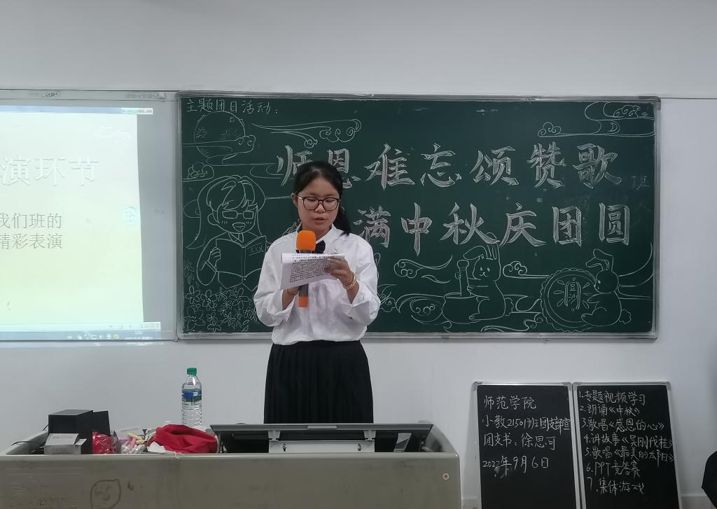 本站讯(师范学院 霍文杰 学生记者  陶敏)情满中秋,师恩难忘。在这“双节”来临之际,为更好地弘扬尊师重教良好风尚,进一步推进师德建设,同时以喜闻乐见的方式弘扬中华民族优秀传统文化,助推传统文化教育走深走实,师范学院于202296日晚在新校区和中职中技部联合开展了“师恩难忘颂赞歌·月满中秋庆团圆”主题团日活动,此次活动由师范学院学生会工作人员进行观摩与指导。