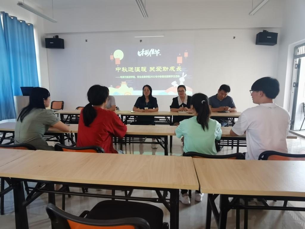本站讯(电商与旅游学院 樊鸿儒) 中秋佳节来临之际,为进一步提升学院“资助育人”工作实效,切实推进家庭经济困难学生资助工作落细落实,电商与旅游学院、财会与金融学院于9月8日下午2点30分在博达楼A301会议室召开“中秋送温暖,关爱助成长”家庭经济困难学生代表慰问活动,校党委委员、副校长易滨秀、学院院长陈洪、学院党总支书记王玮、学院党总支副书记毕发钱看望我院家庭经济困难学生黄牙秀、王丽媛,为她们送去节日的祝福。