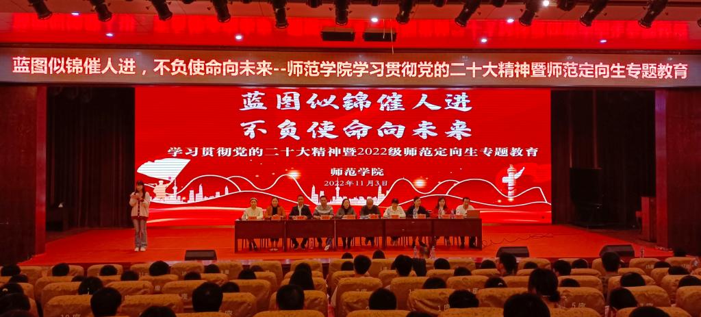 本站讯(师范学院 周思昀)秋雨送爽、大地流金。11月3日晚,师范学院学习宣传贯彻党的二十大精神暨师范生师德养成专题教育会议在中职中技部学术报告厅举行。师范学院全体中层领导、辅导员、班主任以及2022级五年制全体学生,2021级、2020级五年制学生代表参加了会议。