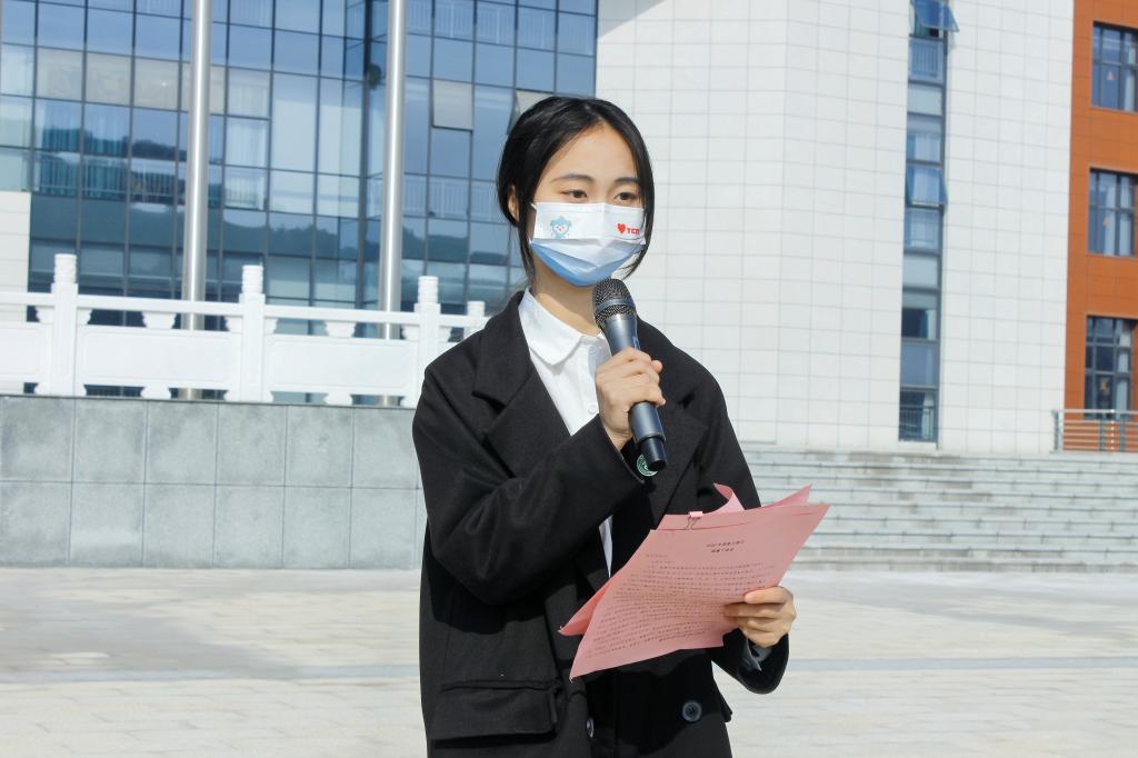 校学生会骨干李文清带领大家重温历史,感受先辈的革命精神,并鼓励同学们勇担新世纪复兴中华民族的“脊梁”,坚定地扛起时代赋予青年的使命,共同护卫锦绣中国。