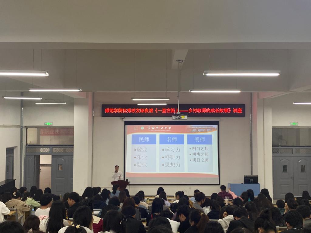 本站讯(师范学院 暨琨)为加强2023届毕业生的就业指导,明确岗位需求,提升就业信心,4月14日下午,师范学院特邀2014届优秀毕业生邱良清回校,在正心楼A108阶梯教室开展《一直在路上——乡村教师的成长故事》讲座。师范学院2023届毕业生踊跃报名,积极参与。