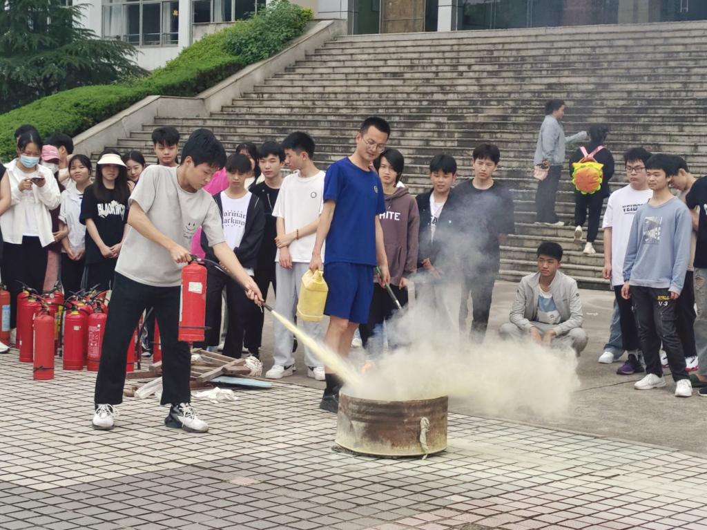 灭火演练开始,消防员耐心细致地为同学们讲解灭火器的种类、如何辨别真假灭火器、正确使用干粉灭火器等消防知识。紧接着消防员强调使用消防设施的要点,耐心演示后,接下来带领同学们进入使用灭火器、消防水带的灭火实操。在消防员的指导下, 同学们准确判断发生火灾的风口,有条不紊地打开消防水带,对准着火点扑灭火苗……