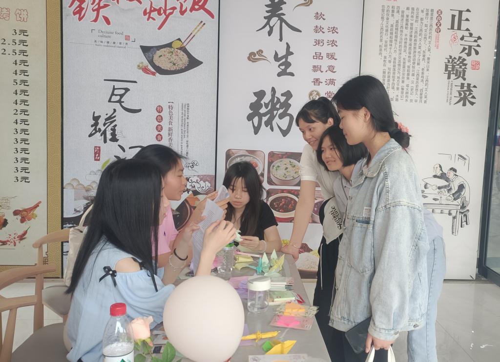 “同学,你是如何理解习近平总书记说的‘人世间的一切幸福都需要靠辛勤的劳动来创造’?”“你最近参与的一次劳动活动是什么?”活动当天,协会工作人员热情地与同学们沟通交流,邀请大家参与劳动知识对错问答,深化对劳动精神的理解。与之一同开展的还有“你画我猜”互动小游戏,同学们两两合作,猜出各行各业劳动人民的形象,齐力赢取心仪的小礼品。在折纸互动体验中,同学们参与折出手工纸花,感悟劳动的过程与收获的喜悦。