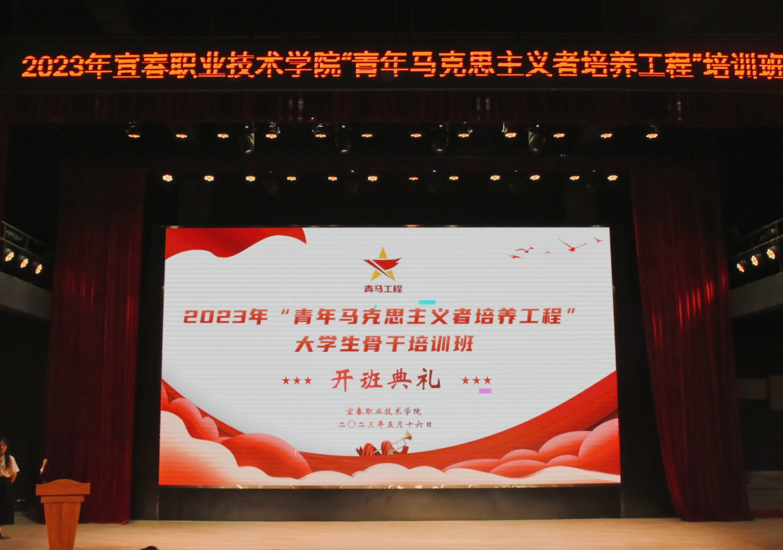 本站讯(团委 梅应轩 学生记者 龙云飞 涂杏容)为深入学习贯彻党的二十大精神和习近平新时代中国特色社会主义思想,培养坚定的青年马克思主义者,5月16日下午,伟德官网在博达楼演播厅举行2023年“青年马克思主义者培养工程”培训班开班典礼。副校长刘叶建、各二级学院团总支书记、校团委全体工作人员及210名大学生骨干和优秀青年学生代表参加典礼,校团委书记施旸担任主持人。