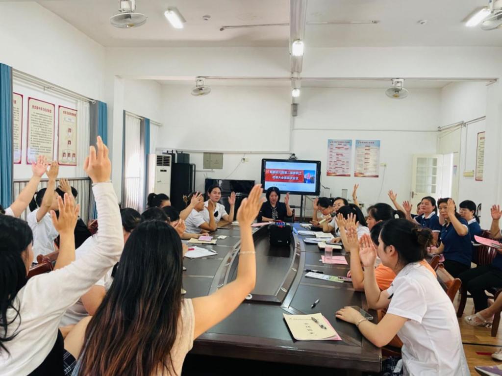 本站讯(鲲鹏幼儿园 王丽思)为切实推进民主管理,保障教职工权益,凝聚全体教职工的力量,充分发挥教职工工作积极性和创造性,7月11日,鲲鹏幼儿园第二届教职工代表大会第四次会议在四楼会议室召开。园长颜美珍及教职工代表共计32人参会,会议由党支部副书记徐艳梅主持。