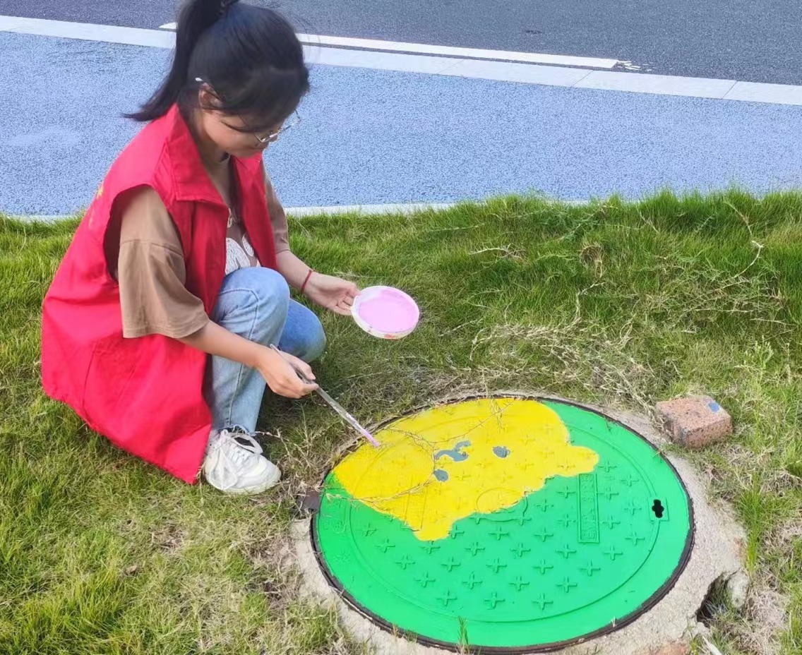 活动现场,充满着青春活力的同学们执起画笔,以井盖为“画布”,从勾勒线条到填充颜色,在不影响井盖功能的前提下,利用井盖的形状和外貌特征,充分发挥,一幅又一幅美丽画卷跃然“纸”上。鲜明的色彩、可爱的图案、暖心的提醒,让一个个原本沉寂暗淡的井盖变成一道道靓丽的风景线。学子们用自己的行动,让浪漫与色彩相融,让校园焕发新的光彩。