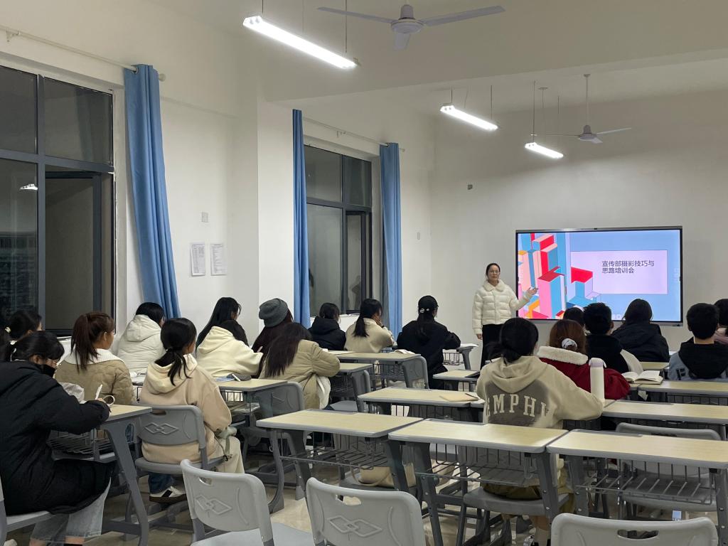 本站讯(国际教育学院 彭娟 学生记者 王昭敏)为增强IE新媒体中心成员摄影技能,进一步规范宣传队伍建设,提高摄影水平及宣传稿件配图能力,11月29日,国际教育学院在博达楼B101开展宣传部成员摄影技能培训会议。会议主持人为辅导员彭娟,宣传部全体成员参加。