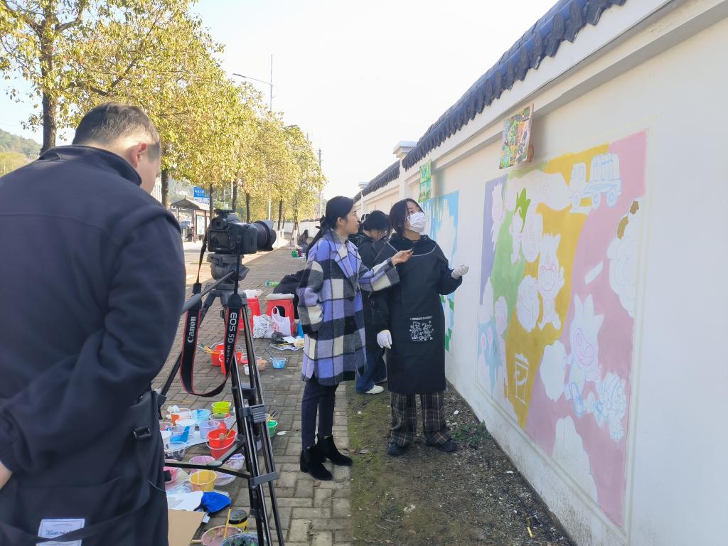 墙绘期间,宜春市广播电视台记者在拍摄过程中看到我们学院的手稿创作非常有创意,并采访了郭雨晴同学,郭雨晴向记者介绍本次墙绘手稿的主题内涵。