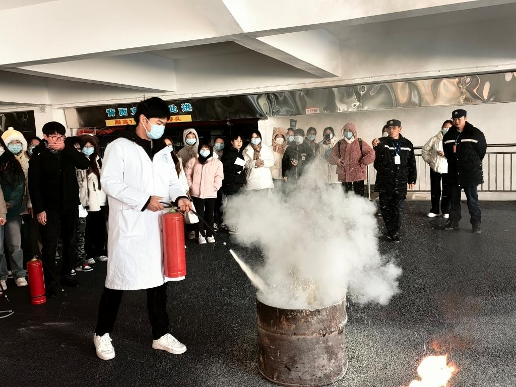 消防疏散逃生演练结束后,保卫处在天工楼前的架空层介绍实验室常见火灾灭火方式,并重点对实验室用品如酒精引起的火灾进行应急处置示范;消防工作人员展示了灭火器的种类、具体功能及使用方法,多名师生通过积极参与体验,熟练掌握灭火器使用方法。