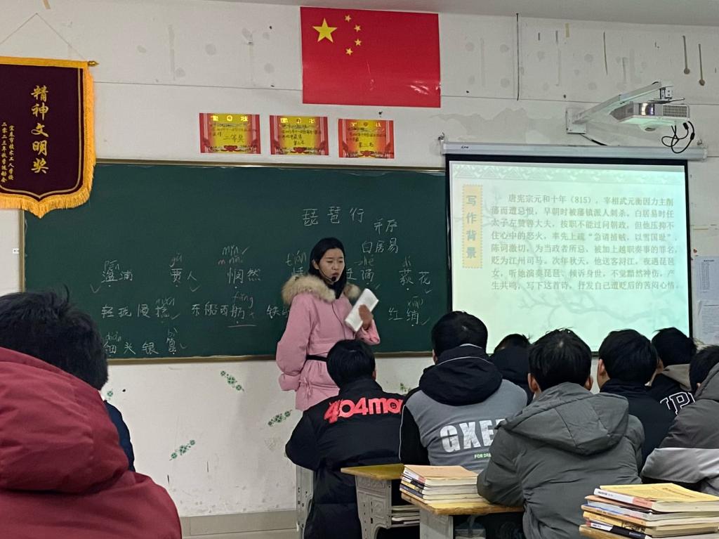 本次公开课由刘随安、彭怡、梁钰三位老师主讲。刘随安讲授的科目为《语文》,授课主题为《琵琶行》。她以一首优美动听的琵琶曲将同学们的思绪带入到课的情境当中,围绕着“谁解沦落人”“谁识琵琶声”这两条线索来设计教学,并与这首诗的双线结构——以歌女的遭遇身世为明线,以诗人的感受为暗线相契合,切入点巧妙,教学脉络简洁清晰。