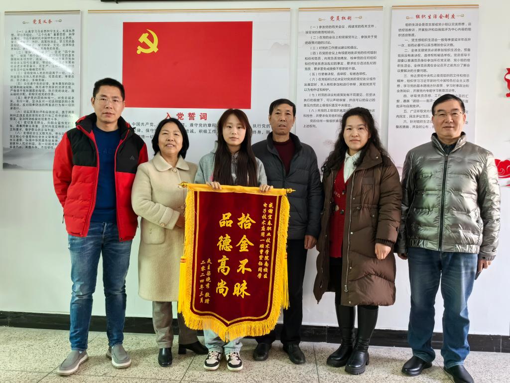 本站讯(技校 许艳娣)3月11日上午,市民柒女士及爱人将一面“拾金不昧 品德高尚”的锦旗送到技校,并向伟德官网电子22J01班曾紫钰同学表示诚挚感谢。这时大家才知道,曾紫钰同学做好事不留名。