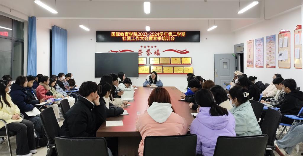 本站讯 (国际教育学院 杨琨 学生记者 占思婕)为强化学生社团思想引领力,提升学生社团活力,助力校园文化蓬勃发展,3月11日晚,国际教育学院团总支在博达楼B502会议室召开2023-2024学年第二学期工作大会暨春季培训会。会议由学院团总支书记杨琨主持,社团工作部全体人员及各社团相关负责人员参加。