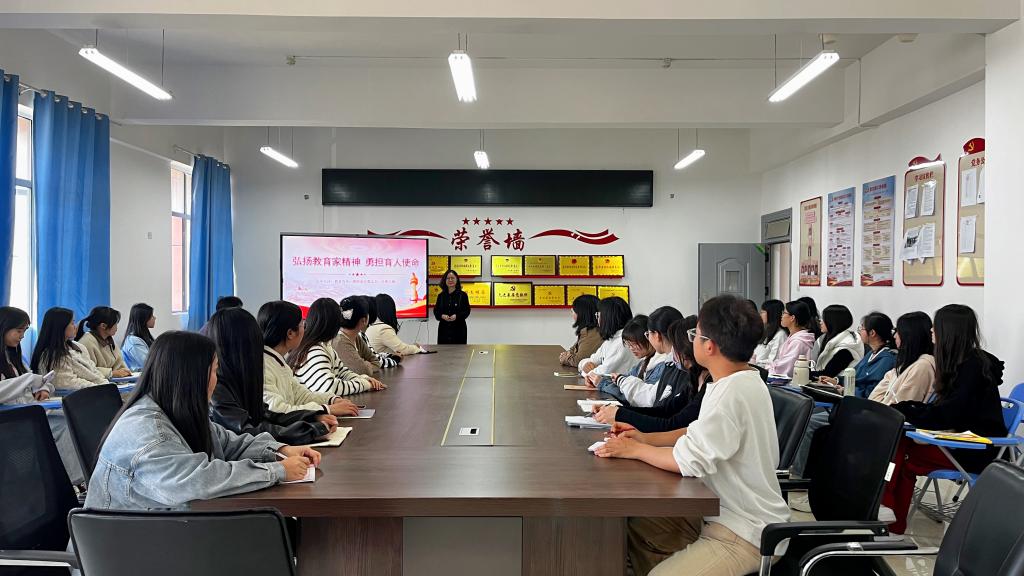 本站讯(国际教育学院 杨琨)为学习贯彻习近平总书记关于弘扬教育家精神的重要指示,扎实推进“春风宜人”师德品牌建设工作,强化教师队伍,引领师范生卓越成长,3月28日下午,国际教育学院党总支书记刘海云面向学院党员教师、入党积极分子及小学英语教育专业的师范生们,在博达楼B座党员活动室讲授主题为“弘扬教育家精神 勇担育人使命”党课。
