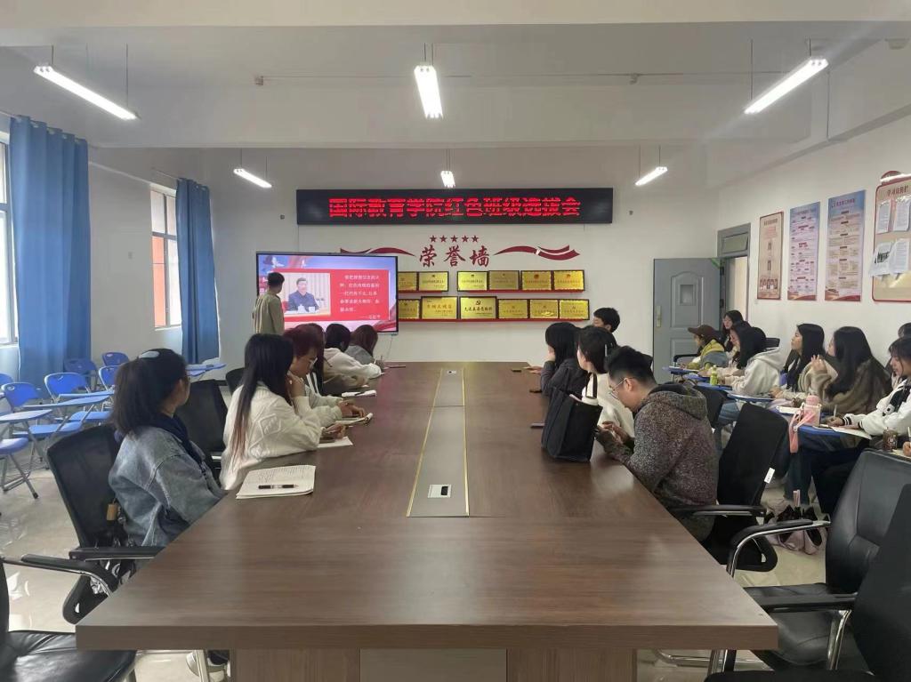 本站讯(国际教育学院 赖培鑫 学生记者 周熙睿)为贯彻落实习近平总书记视察江西时关于“推进传承红色基因”的重要要求,引导青年大学生厚植爱国主义情怀,自觉争当红色基因的传承者、实践者,4月8日中午,国际教育学院在博达楼B502开展“红色班级”评选活动。院长王玮、学团负责人刘嘉妮、团总支书记杨琨和辅导员、班主任及学生代表共同参与。