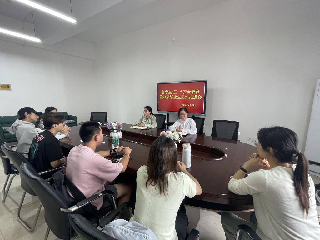 本站讯(国际教育学院 颜灵仪)为确保来华留学生五一假期安全稳定,有效提高留学生安全防范意识,同时确保24届留学生毕业工作稳步进行,4月29日上午,伟德官网在博达楼B501召开留学生“五一”安全教育暨24届毕业生工作推进会,会议由国际合作与交流处处长刘海云处主持,副处长杨慧、干事颜灵仪、全体留学生及其班主任参与。
