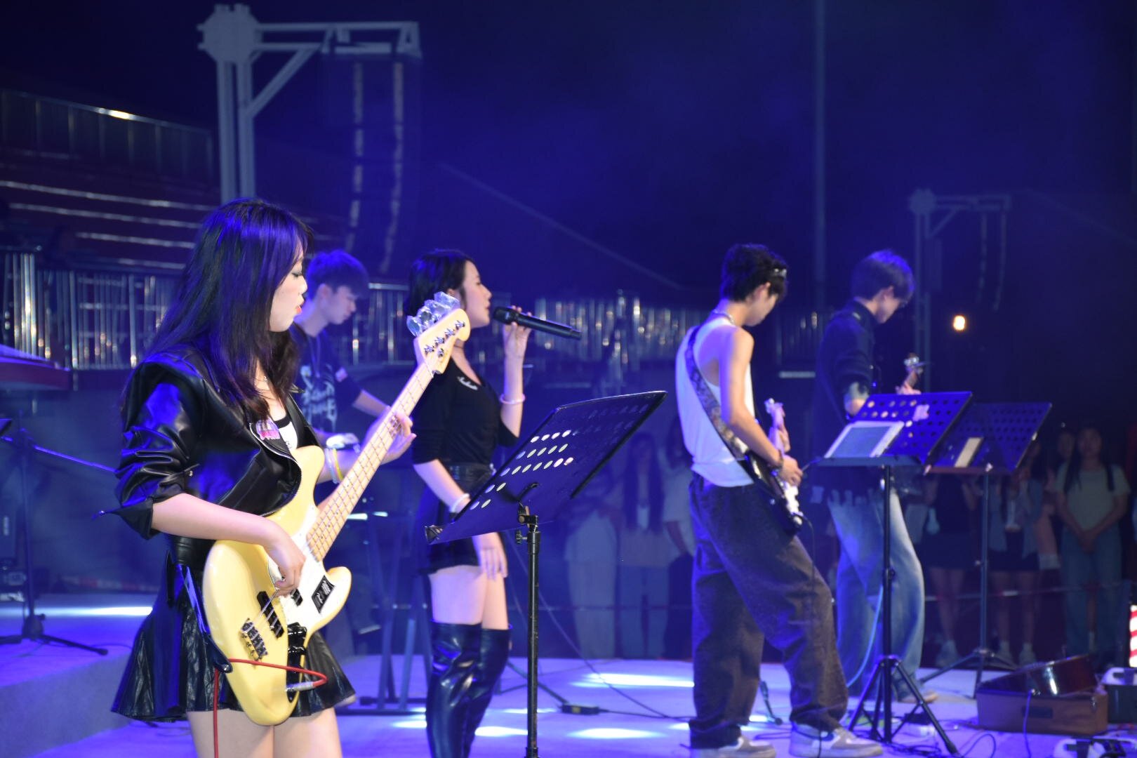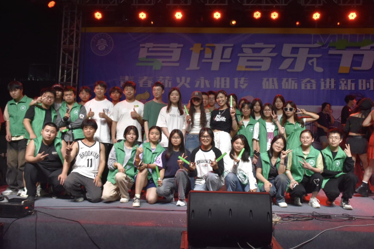 活动现场,同学们有序领取荧光棒入场,在闪烁的荧光与激情的欢呼中,音乐节正式拉开帷幕。