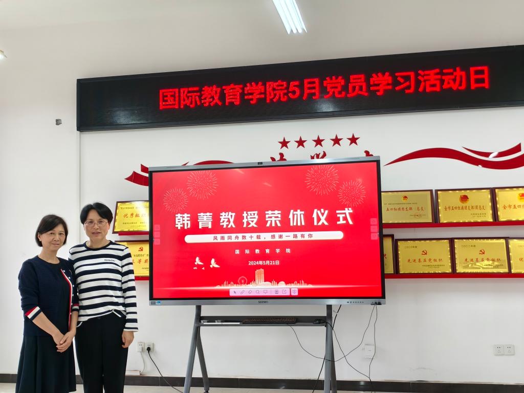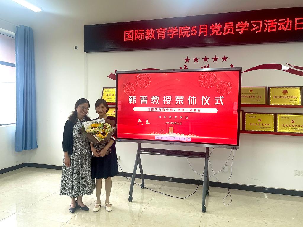 本站讯 (国际教育学院 刘婷)岁月染芳华,桃李育芬芳。5月21日下午,为感谢退休教师韩菁教授数十年如一日的默默坚守和无私奉献,进一步增强教师凝聚力,激励学院教师传承前辈的育人精神,一场温馨的庆祝荣休仪式在博达楼B502会议室举行。校党委委员,副校长刘江毅,国际教育学院党政班子全体成员及学院全体老师出席仪式。仪式由院党总支书记刘海云主持。