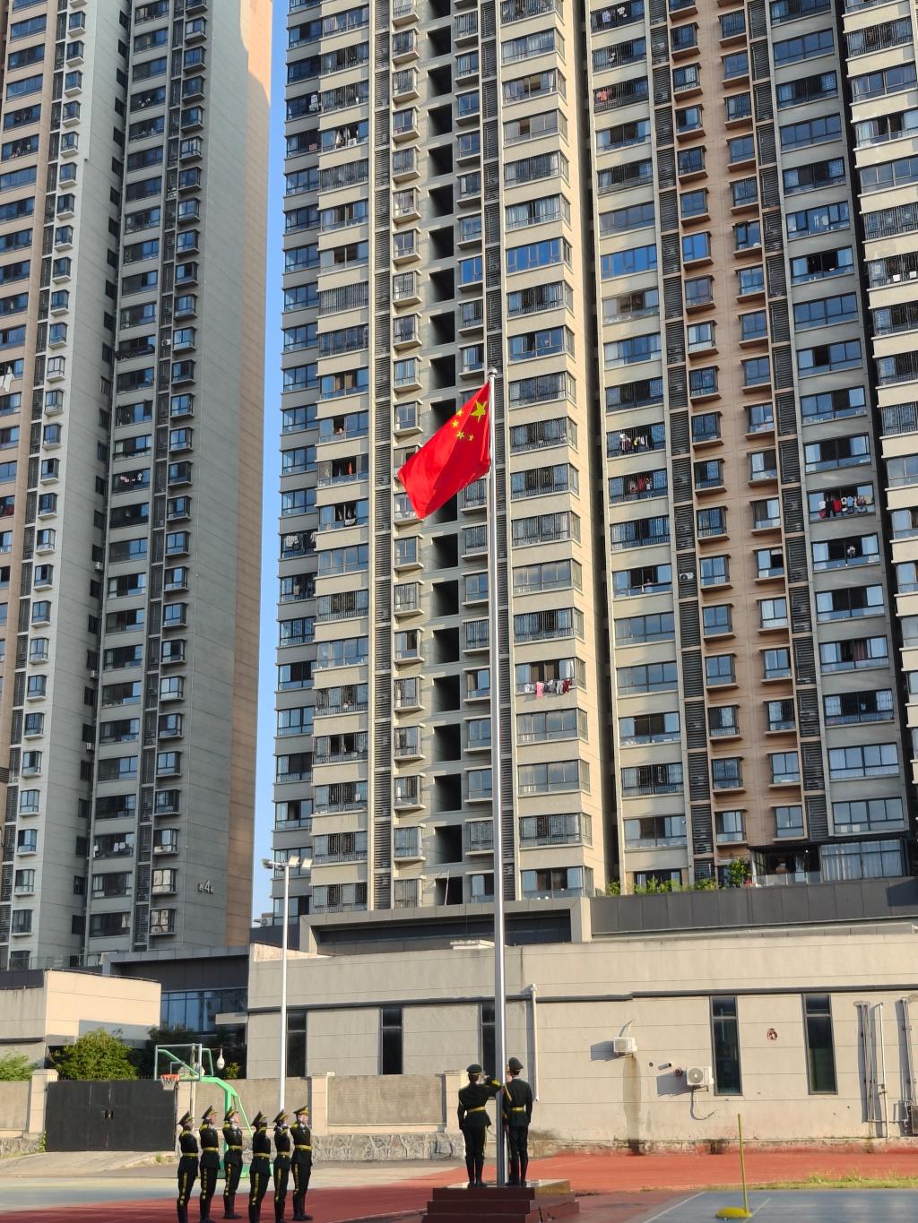 全体师生着装统一、队伍秩序井然,国旗护卫队迈着矫健的步伐,护旗入场。鲜艳的五星红旗在庄严的国歌声中冉冉升起,迎风飘扬,全体师生怀着对祖国的崇高敬意,向国旗行注目礼,表达对祖国的无限热爱和深情祝福。
