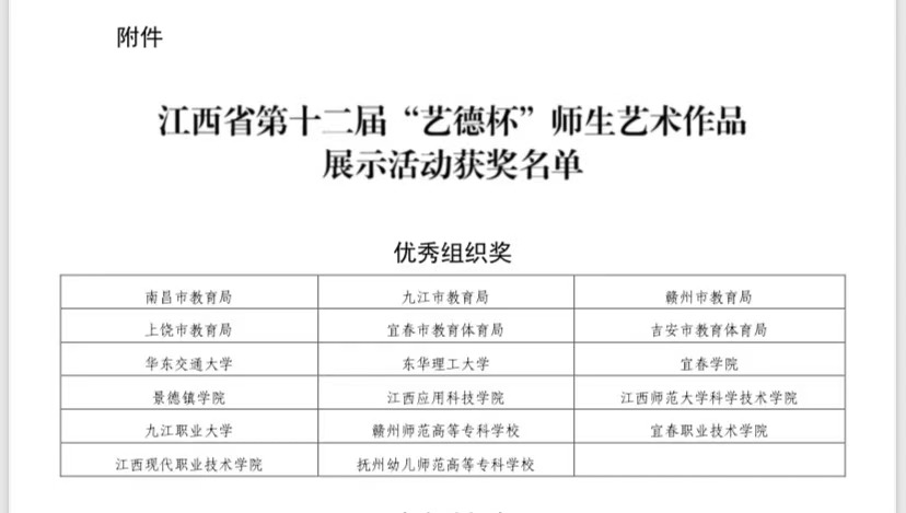 本站讯(艺术与设计学院 曹斐)为深入贯彻落实中共中央办公厅、国务院办公厅及教育部、省政府办公厅关于全面加强和改进新时代学校美育工作的相关意见和实施方案精神,进一步强化学校美育育人功能,弘扬中华美育精神,伟德官网师生积极参加江西省第十二届“艺德杯”比赛。