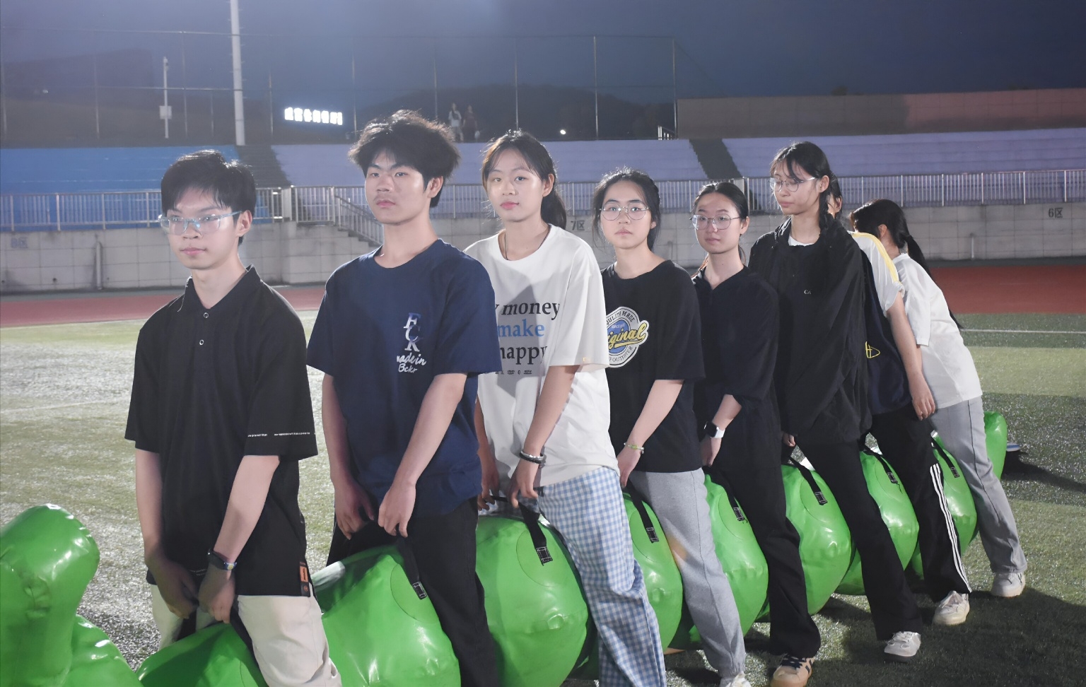 在“毛毛虫赛跑”协作挑战环节中,青马班学员们以小组为单位,驾驭特制道具,齐心协力向前,嘹亮的口号此起彼伏,充分展现了青春活力;“龟兔赛跑”环节则考验团队智慧与策略,各小组或稳扎稳打,或出奇制胜,在策略博弈中领悟脚踏实地与创新突破的辩证关系;压轴的“火箭赛跑”环节将活动推向高潮,四人小组默契配合搬运巨型充气火箭,矫健的身影彰显了当代青年的蓬勃朝气。