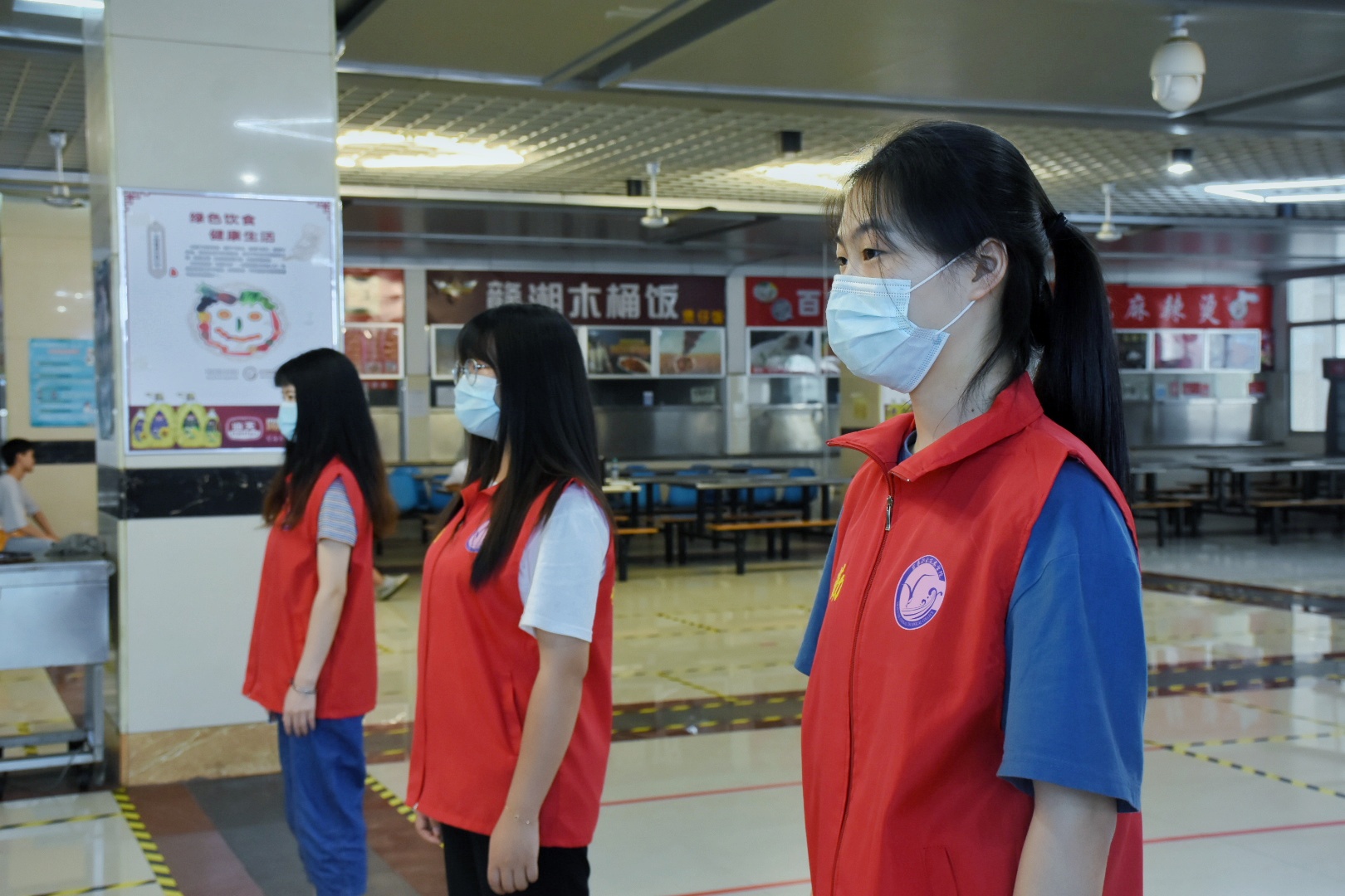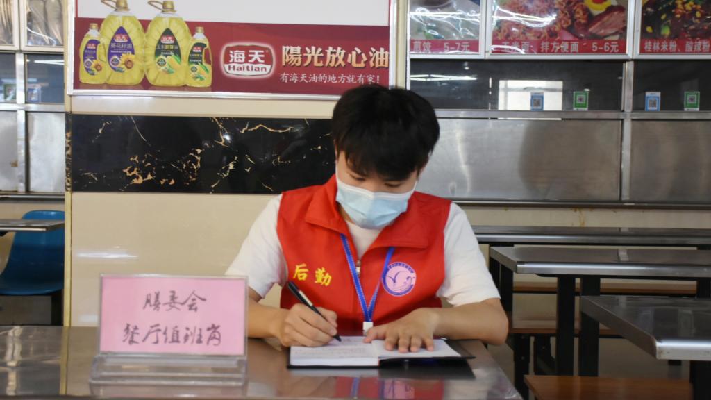 在食堂值班站岗的志愿者们负责做好同学们进出食堂的引导工作,提醒大家保持间隔一米的安全距离,保持有秩序不拥挤的打饭通道。在宿舍各楼层里轮流值班站岗的志愿者们,尽职尽责地在所负责的寝室区域对学生活动进行值守,提醒大家不要在宿舍之间串门,避免感染风险。在教学楼值班站岗的志愿者们毫不懈怠,提醒同学们在保持安全距离的前提下,检查同学们的仪容仪表以及是否正确佩戴口罩,并提醒同学们不要将一次性快餐盒带入教学楼,防止在教室摘下口罩进食的不安全行为。
