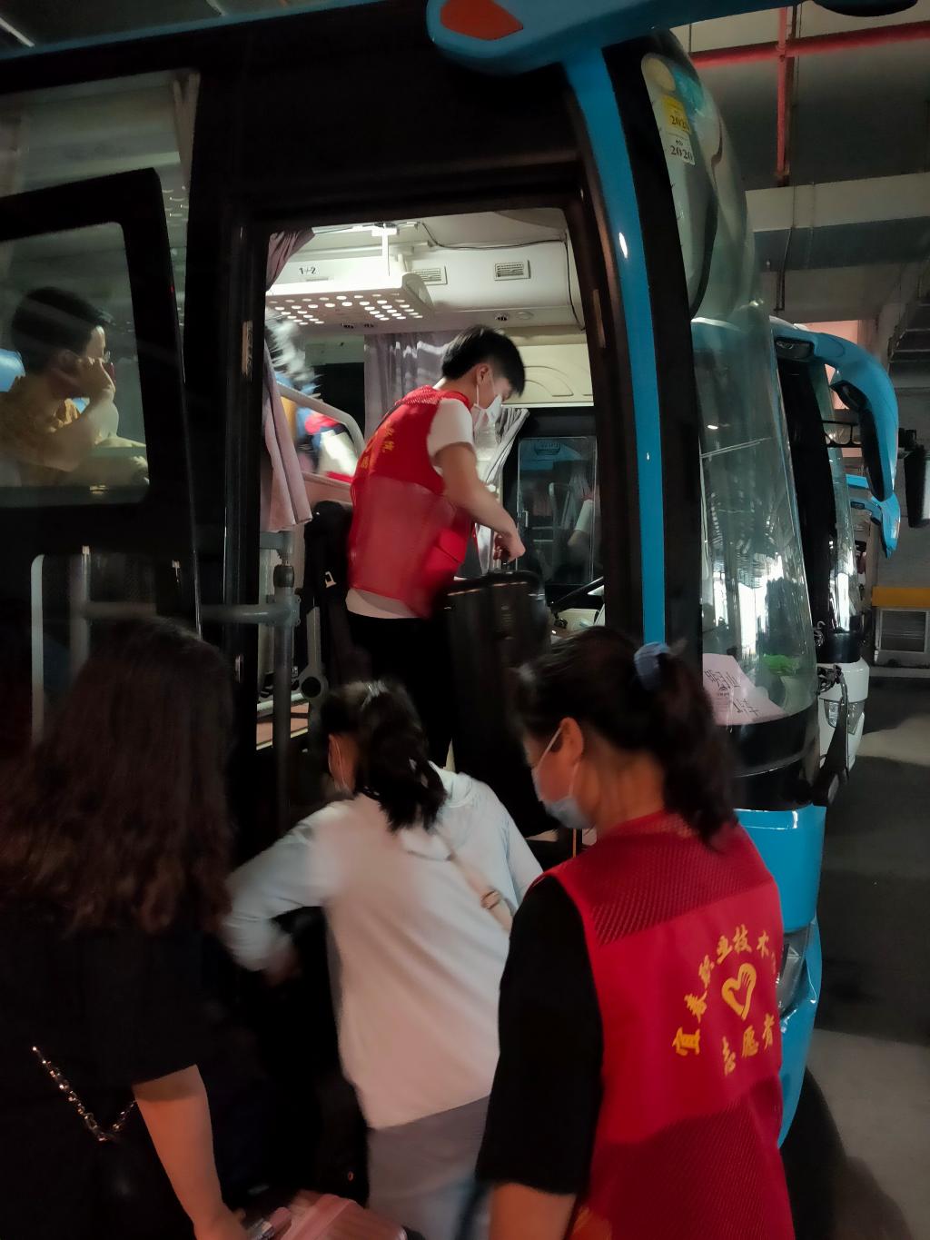 在偌大的车站内,青年志愿者们身穿红色马甲,面带微笑地引导每一位学生搭乘学校的车辆返校。对于同学们提出的一系列疑问,志愿者们都耐心地解答。当了解到校园直通车会因故晚点时,志愿者们立即安抚已到站的同学,并及时与负责老师、车队对接,温言细语抚平了同学们焦躁的心。校园直通车到达站点后,志愿者们组织同学们有序地上车,并贴心地为他们搬运行李、指引返途路线。即使人数多,任务重,志愿者们仍以最好的状态、最热情的笑容迎接一批批同学安全返校,为校园防疫工作贡献一份力量,他们不怕苦不怕累的精神得到了老师、学生家长的高度赞扬。