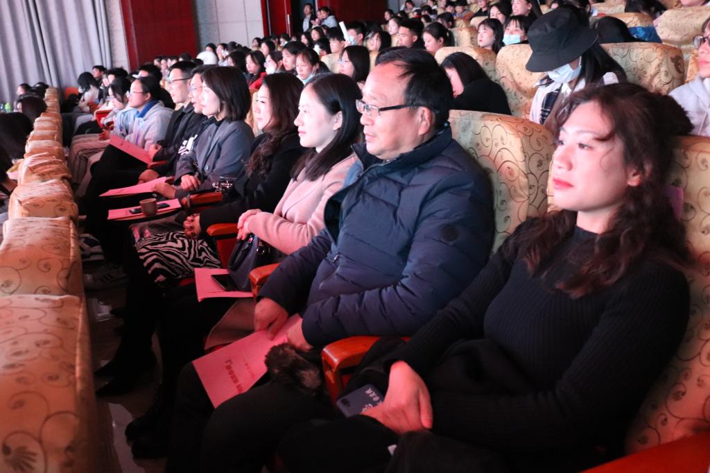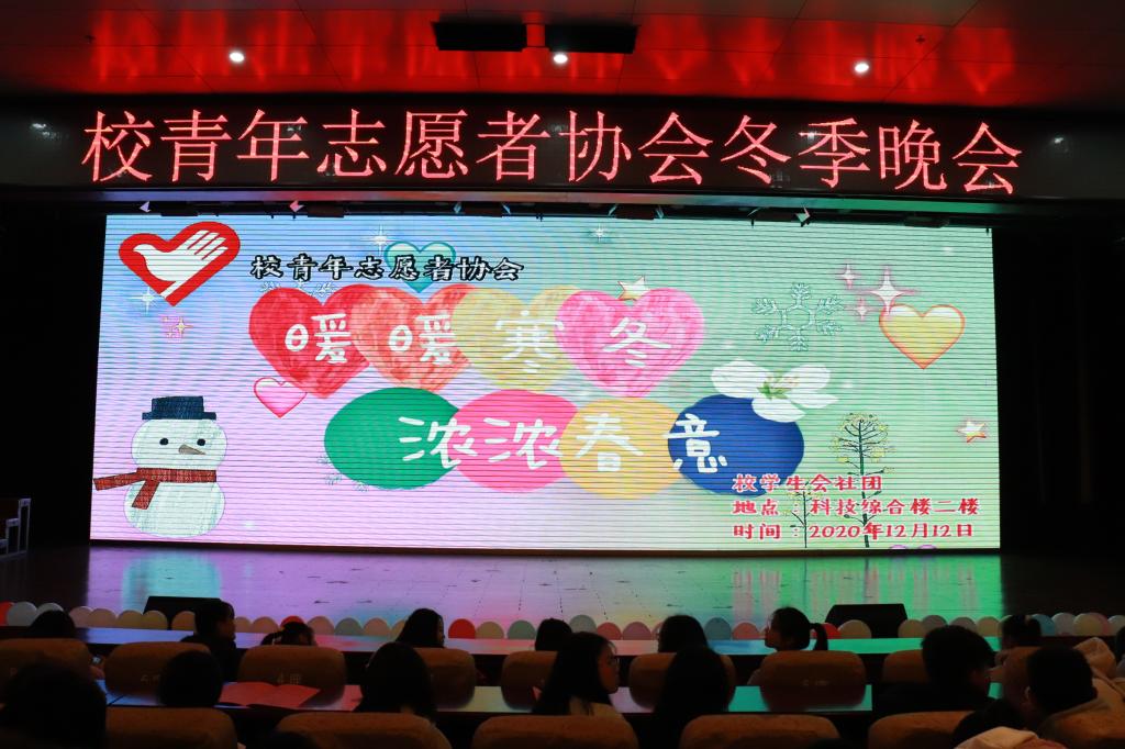 本站讯(团委 梅应轩 学生记者 彭洋 邱丰)热血青春展芳华,情至青协谱新篇。12月12日晚,校青年志愿者协会于科技综合楼二楼报告厅举办2020年冬季晚会,马克思主义学院负责人彭慧洁、军事体育部老师左晖、学工处老师孙光、校团委全体老师出席本次活动,校青年志愿者协会全体成员及青年学生共400余名观看晚会,本次晚会由校广播站朱明泉、校青年志愿者协会刘媛主持。